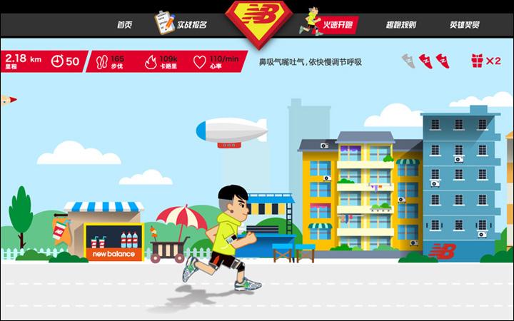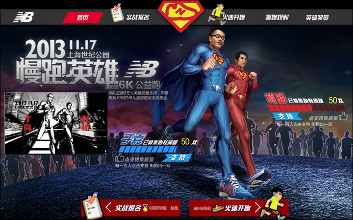 作為其互動營銷代理商的Leadinfo(立特整合營銷傳播機構)便以英雄扮演的趣味方式為New Balance創(chuàng)意了一款在線趣跑游戲http://newbalance.renren.com,用戶只需用人人網賬號登錄,即可選擇卡通角色邊跑邊體驗身為英雄的快感。