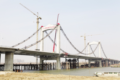 昨天上午,記者登上大慶路淮河公路橋主橋面時(shí),熱鬧的施工現(xiàn)場(chǎng)與寒冷的天氣形成了鮮明的對(duì)比。大橋最南端的接線上,幾臺(tái)機(jī)器正在攤鋪?zhàn)詈笠粚訛r青。大慶路淮河公路橋建設(shè)指揮部技術(shù)質(zhì)量部部長薛峰告訴記者,橋面瀝青一天之內(nèi)就能鋪好。“瀝青是最后一道主要工序,完成后就標(biāo)志大橋主體大功告成了。”